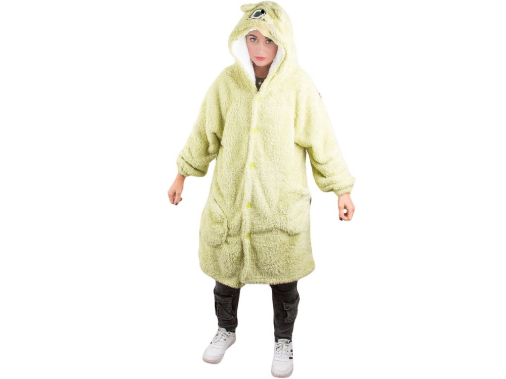Ciepła bluza koc, miękki produkt o funkcjonalności szlafroka i koca jednocześnie. Wykonana z ciepłego materiału, idealnie sprawdza się na chłodne dni, otulając całe ciało. Posiada kaptur, na którym znajduje się jedno oko, nadając bluzie zabawny, potworny charakter.