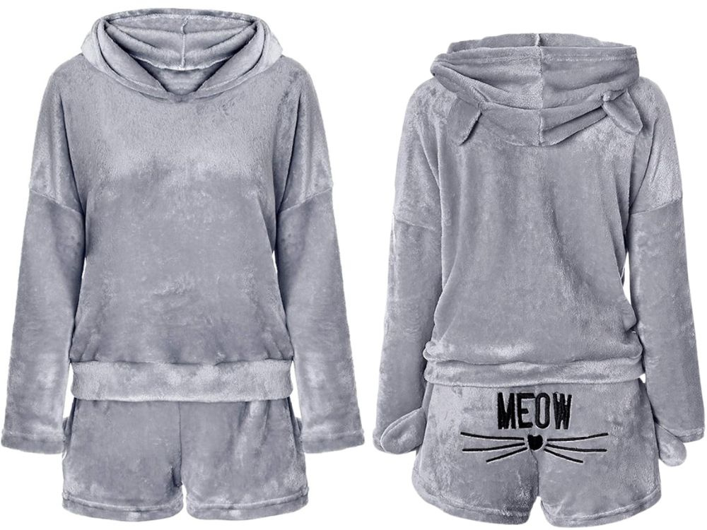 Ciepła piżama w kolorze szarym, rozmiar L, składa się z kompletu z długim rękawem i krótkimi spodenkami. Wykonana z miękkiego, przyjemnego w dotyku materiału, zapewnia komfort podczas snu, szczególnie w chłodniejsze noce.