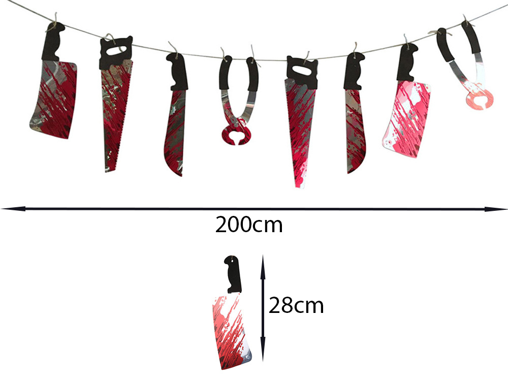 Girlanda przedstawia realistycznie wyglądające narzędzia, takie jak noże, piły czy tasaki, które wydają się być pokryte świeżą krwią, co jeszcze bardziej podkreśla przerażający efekt wizualny.