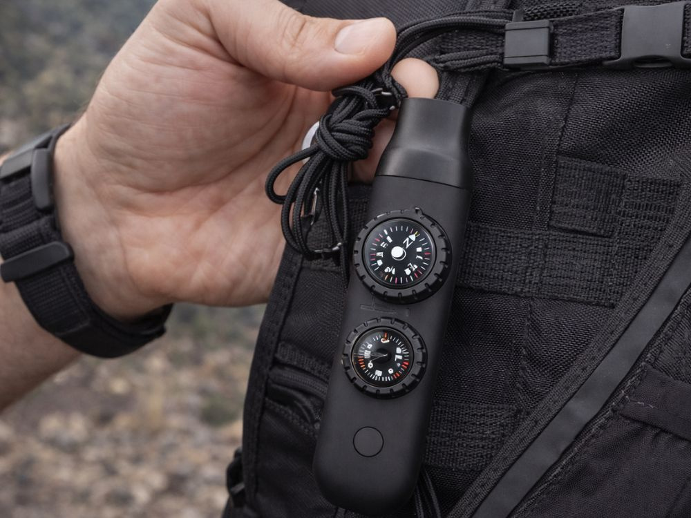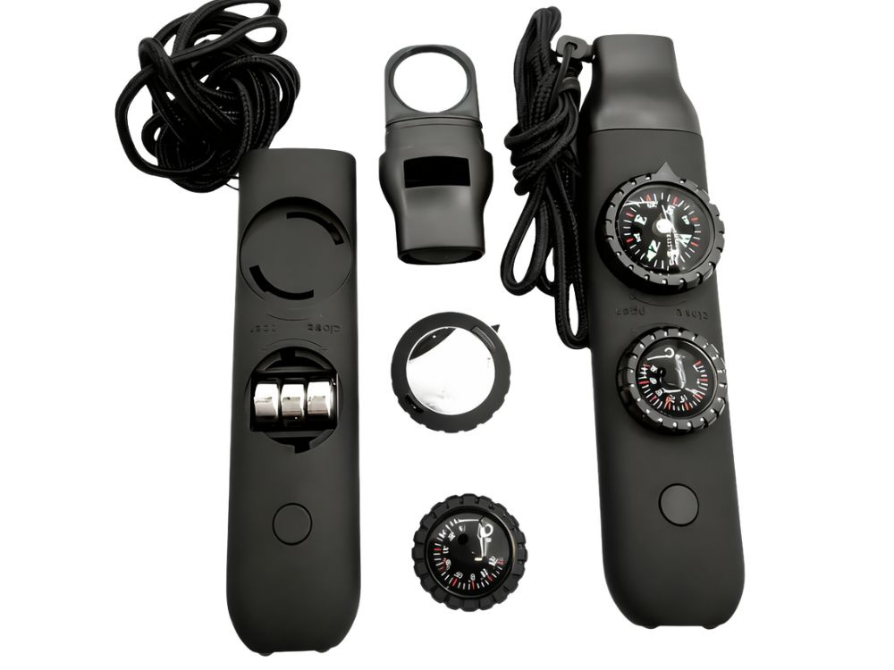 Wielofunkcyjne narzędzie outdoorowe łączące w sobie gwizdek ratunkowy, kompas, latarkę, lupę oraz termometr. Kompaktowa konstrukcja pozwala mieć pod ręką niezbędne akcesoria podczas wypraw, biwaków i aktywności w terenie.