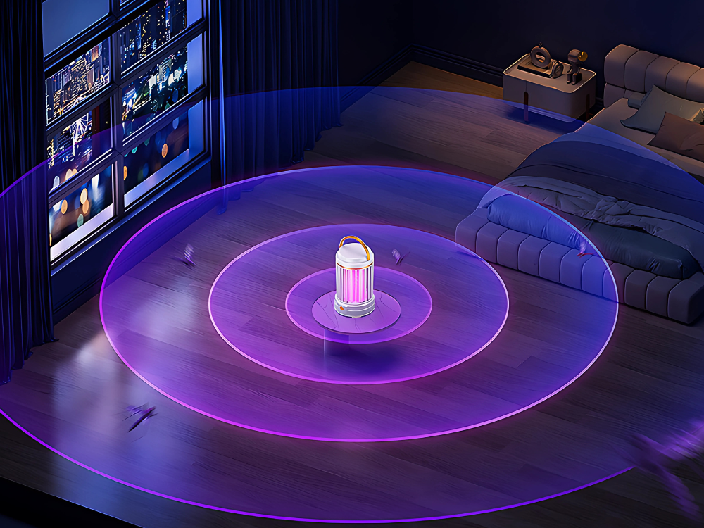 Lampa oferuje dwa tryby działania. Po włączeniu uruchamia się światło UV eliminujące owady. Natomiast po dłuższym przytrzymaniu przycisku aktywuje się delikatna lampka umieszczona w podstawie, która idealnie sprawdzi się jako nastrojowe światło nocne lub pomocnicze źródło światła w plenerze.