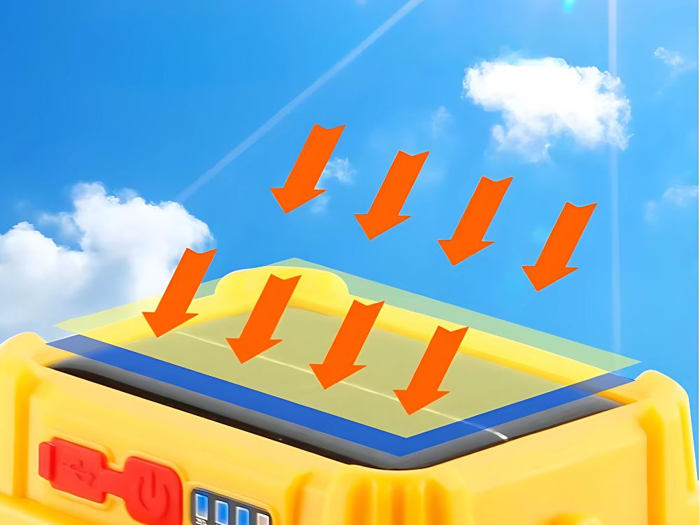 Wbudowany panel solarny umożliwia ładowanie lampy na słońcu, a dodatkowy port USB pozwala na szybkie doładowanie w razie potrzeby.