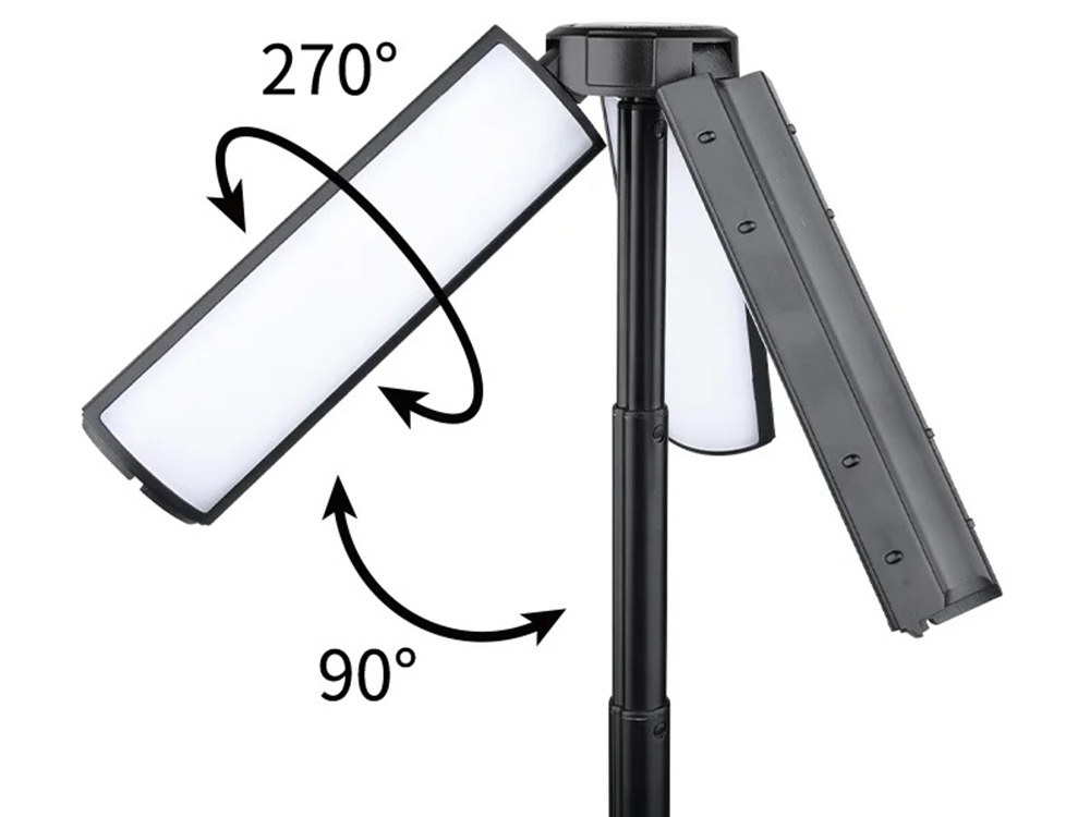 Na górze lampy znajdują się trzy ruchome skrzydła z 54 ciepłymi diodami LED, które rozświetlają otoczenie szerokim kątem. Każde skrzydło można niezależnie regulować w zakresie 270° i odchylać do 90°, co pozwala idealnie dostosować kierunek światła. Dolna część lampy posiada dodatkowo mocną diodę LED z funkcją ZOOM – umożliwia skupienie światła w jednym punkcie, idealna jako latarka ręczna.