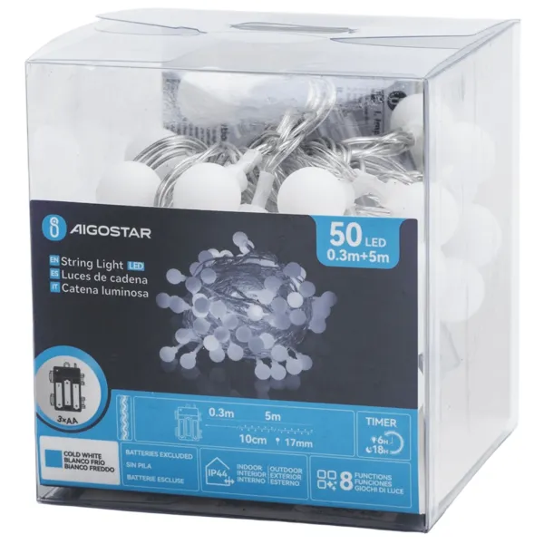 • 50 diod LED w eleganckich mlecznych kulkach rozłożonych co 10cm na 5-metrowym przewodzie
