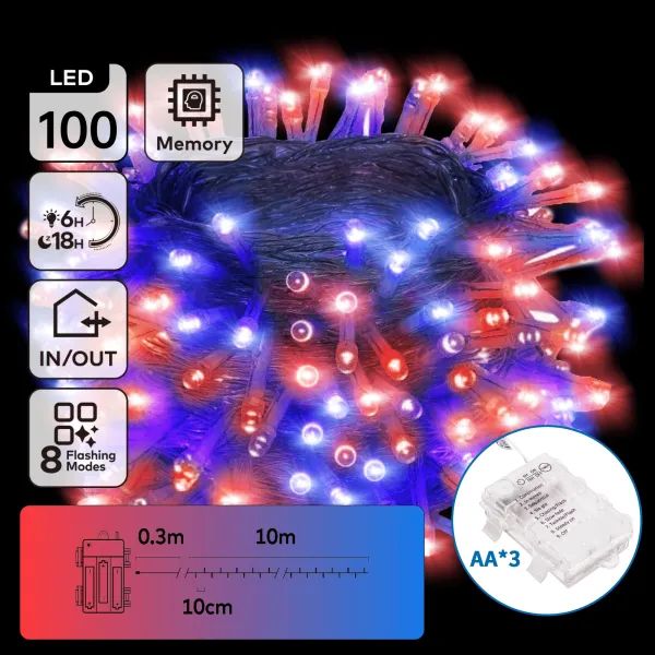 • 100 diod LED w kolorach czerwonym i niebieskim na 10-metrowym sznurze • Zasilanie bateryjne 3xAA - pełna swoboda umieszczenia bez kabli • 8 trybów świecenia z funkcją pamięci i timerem • Stopień ochrony IP44 - idealne do użytku wewnętrznego i zewnętrznego • Temperatura pracy -25°C do +45°C - niezawodne przez cały sezon