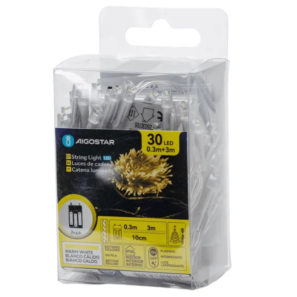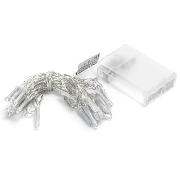 • Długość: 3 metry • Liczba LED: 30 sztuk • Odstęp między diodami: 10 cm • Zasilanie: DC 1.5V x 3 baterie AA • Funkcje: włączanie/wyłączanie/świecenie • Kolor przewodu: przezroczysty • Komora na baterie: przezroczysta
