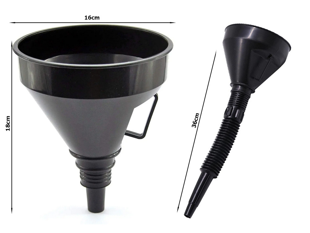 Lejek rozkłada się na dwie części. Można go używać samodzielnie lub z harmonijkowym przedłużeniem, które ułatwia precyzyjne nalewanie płynów.