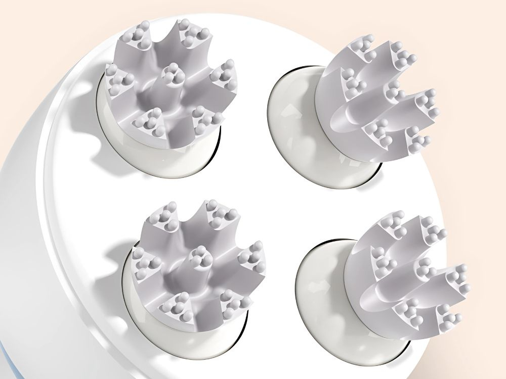 Urządzenie zostało zaprojektowane z myślą o komforcie użytkowania. Cztery masujące głowice z elastycznymi wypustkami obracają się w dwóch kierunkach, zapewniając intensywny i skuteczny masaż. W zestawie znajdują się również wymienne końcówki, które można łatwo zdjąć i wyczyścić. Masażer można stosować również na kark, ramiona lub inne partie ciała.
