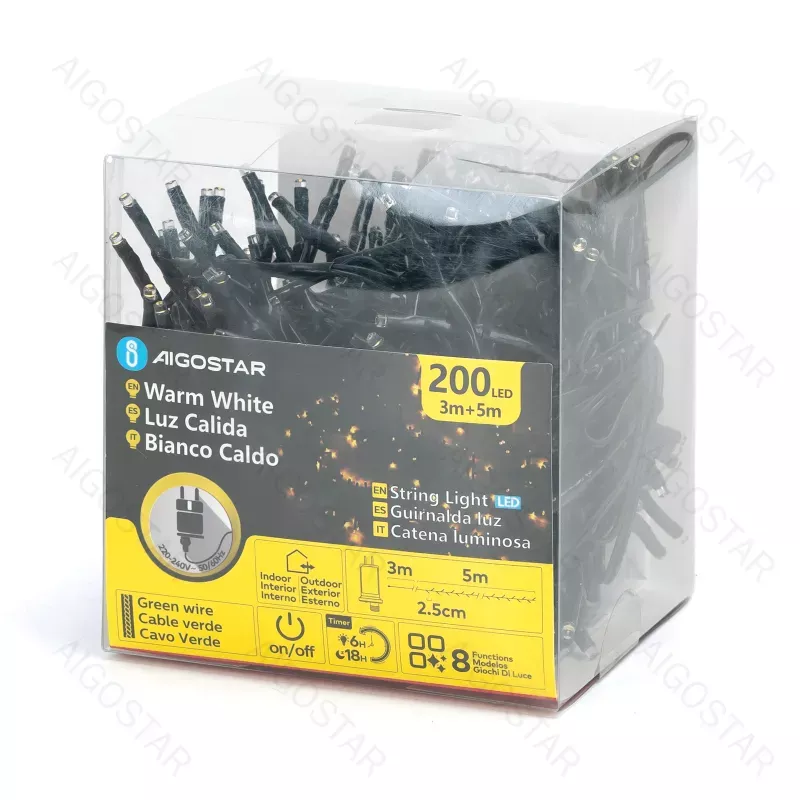 Niskonapięciowe zewnętrzne lampki choinkowe sznur 200LED Ciepła biel 5m+3