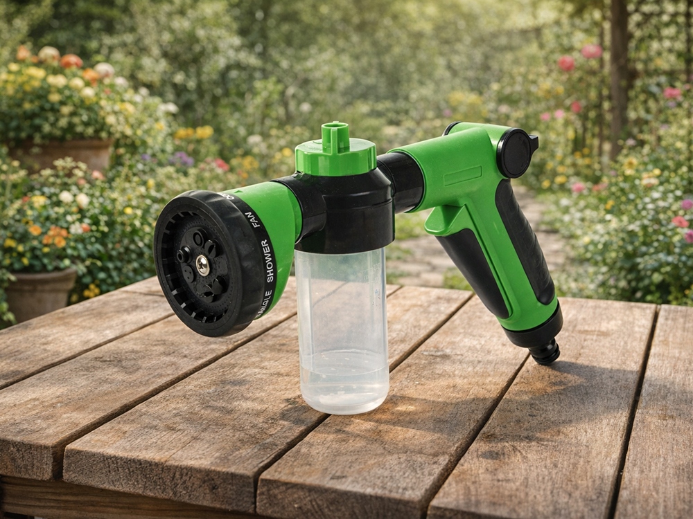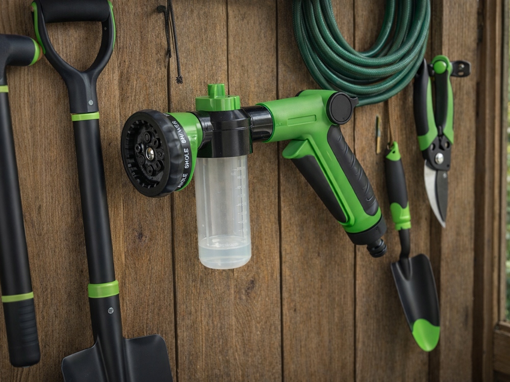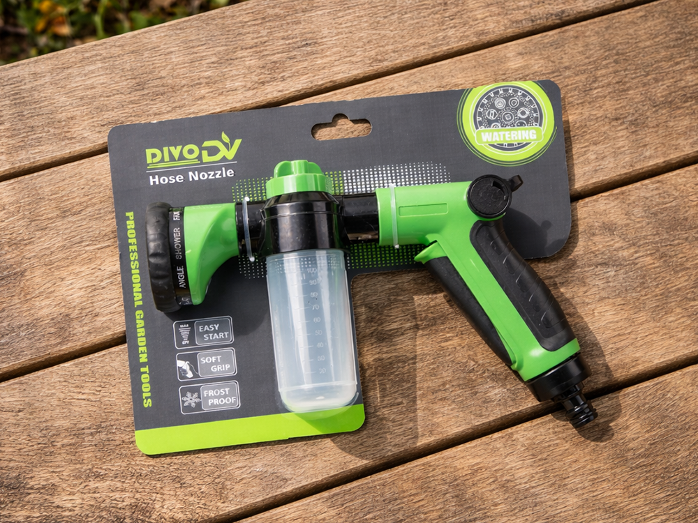 Praktyczny pistolet ogrodowy to uniwersalne narzędzie do podlewania, mycia oraz pielęgnacji przestrzeni wokół domu. Dzięki zintegrowanemu zbiornikowi możesz jednocześnie aplikować wodę i środek czyszczący lub nawóz, co znacząco usprawnia pracę. Solidna konstrukcja oraz wygodny uchwyt sprawiają, że urządzenie dobrze leży w dłoni i zapewnia komfort użytkowania.
