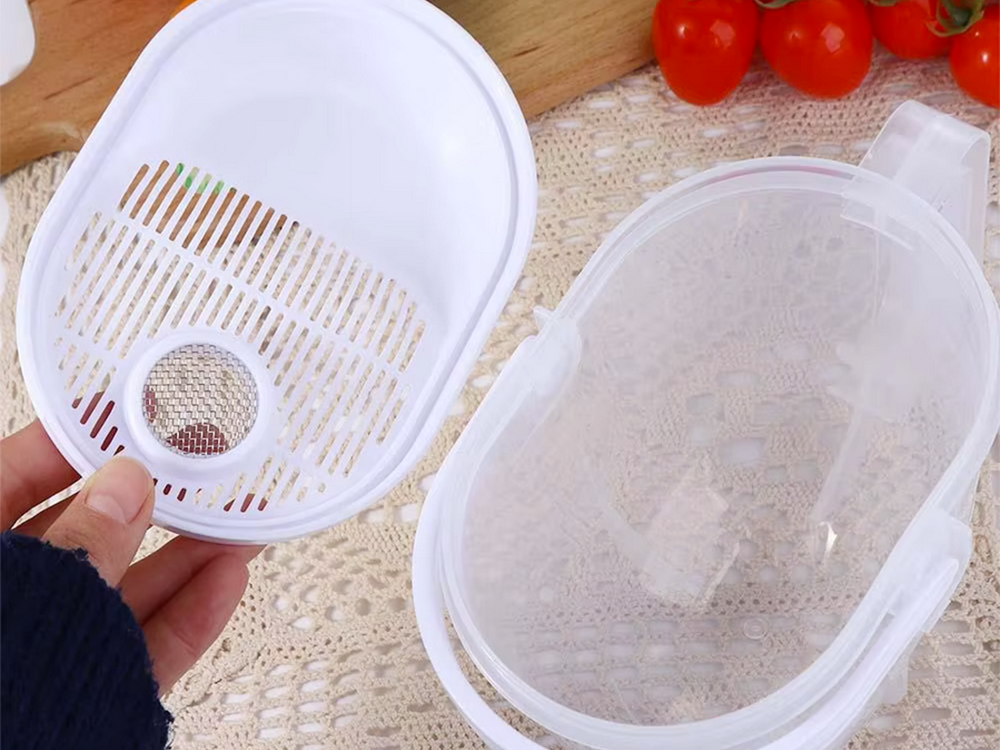 Funkcjonalny pojemnik z wbudowanym sitkiem, idealny do płukania ryżu, kaszy, warzyw czy owoców.