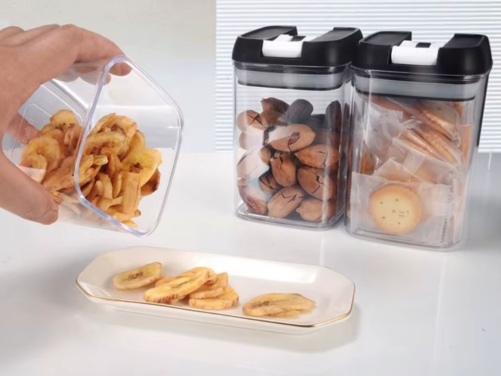 Każdy pojemnik posiada pokrywkę z mechanizmem próżniowym na przycisk. Po jego naciśnięciu powietrze zostaje usunięte z wnętrza, co zapewnia szczelne i bezpieczne zamknięcie. Aby otworzyć pojemnik, wystarczy podnieśc zapięcie – wygodny system otwierania jedną ręką sprawia, że korzystanie z pojemników jest szybkie i komfortowe.
