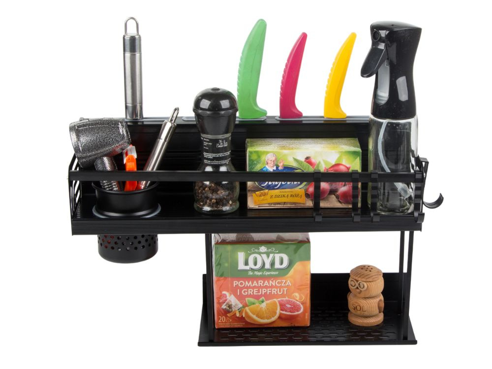 Organizer posiada dwie poziome półki, uchwyty na przybory kuchenne, a także pojemnik na sztućce lub gąbki, co sprawia, że świetnie sprawdzi się zarówno nad zlewem, jak i obok kuchenki. Dzięki perforowanemu dnu woda może swobodnie spływać, co utrzymuje czystość i suchość akcesoriów. Półkę można zamontować na ścianie lub postawić na blacie, w zależności od potrzeb i dostępnego miejsca.