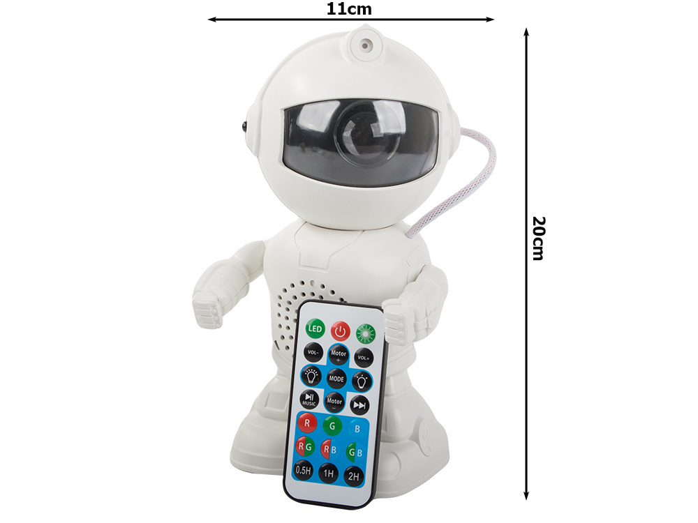 Projektor wyróżnia się niebanalnym wyglądem – kształt stojącego astronauty z ruchomymi rękami, przyciąga wzrok i dodaje uroku każdemu wnętrzu. Figurka wykonana jest z solidnego tworzywa, z dbałością o detale. W hełmie ukryta jest główna soczewka, która obraca się i rzuca światło na sufit lub ściany. Na górze hełmu znajdują się dwie lampki, którer pełnią funkcję bocznych projektorów (stałe laserowe punkty świetlne). To doskonały wybór zarówno dla dzieci, jak i dorosłych – świetnie sprawdzi się jako prezent na każdą okazję.
