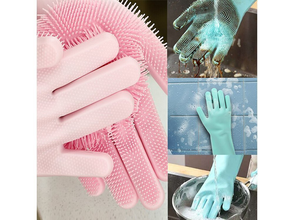 Rękawice mają bardzo szerokie spektrum zastosowania. Dzięki nim z łatwością umyjemy naczynia, posprzątamy kuchnię, łazienkę i wiele innych. Sprawdzą się również jako łapki kuchenne.