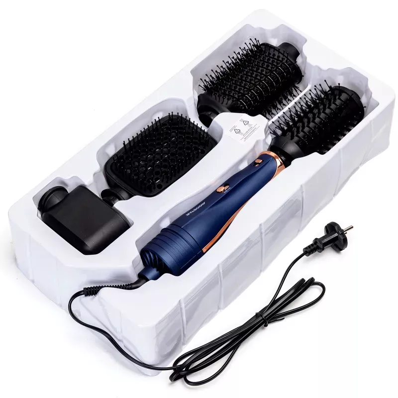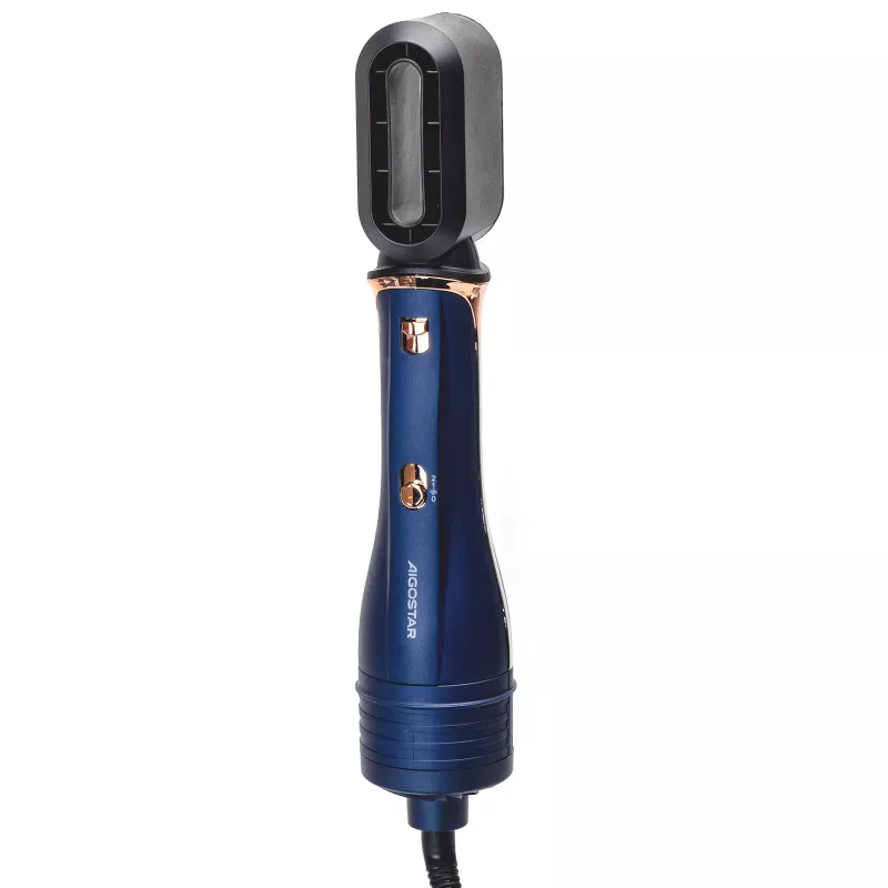 Konstrukcja 3 w 1, suszenie/prostowanie/kręcenie. 3 ustawienia prędkości i temperatury, chłodny nawiew/niska temperatura/wysoka temperatura. W zestawie z 3 różnymi szczotkami. Przewód obrotowy 360°. Wygodna pętla do zawieszania. Niebiesko-złoty matowy wygląd, prosty i stylowy