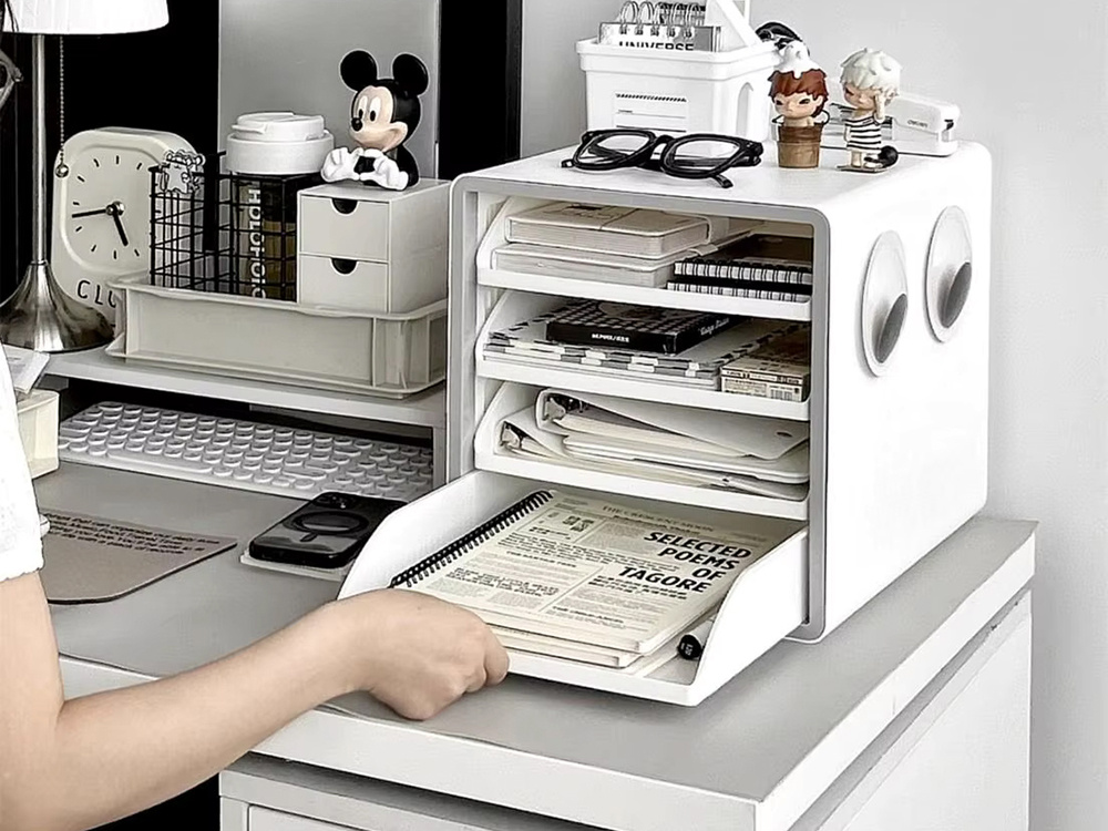 Organizer został zaprojektowany tak, aby maksymalnie ułatwić codzienną organizację. Stabilna obudowa i wysuwane szuflady umożliwiają wygodne przechowywanie dokumentów oraz drobnych przedmiotów, takich jak kalkulatory, długopisy czy ładowarki. Płynne prowadnice szuflad sprawiają, że korzystanie z organizera jest szybkie i komfortowe.