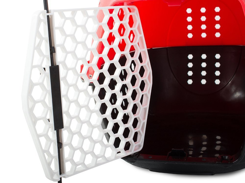 Gumowa wygodna rączka do przenoszenia, z zamykanymi drzwiczkami, które można zamontować tak aby się otwierały zarówno z lewej jak i z prawej strony.