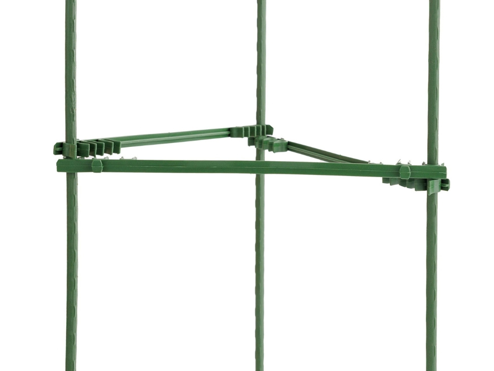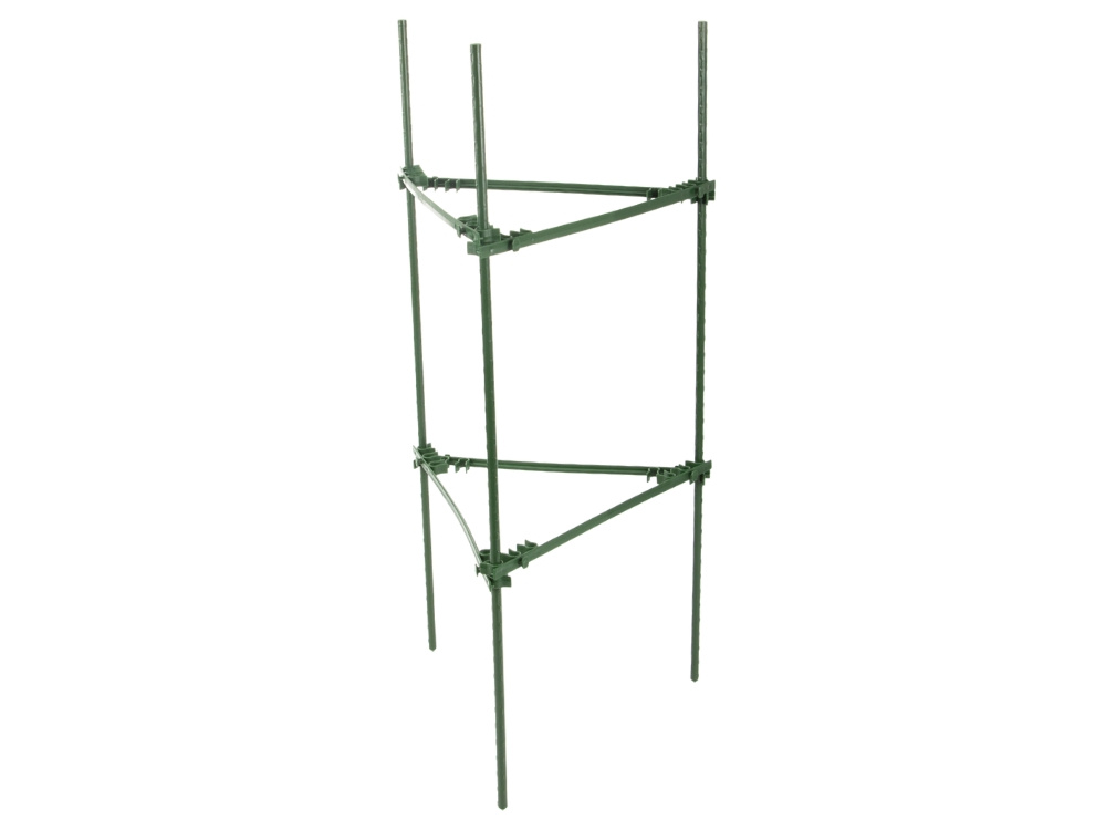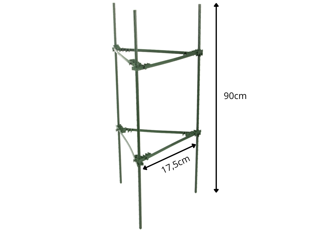 Podpórka została zaprojektowana w formie trójkąta o wysokości 90 cm i boku 17,5 cm, co zapewnia zwartą i stabilną budowę. Taki układ lepiej rozkłada ciężar roślinyiwspiera ją równomiernie z każdej strony. Konstrukcja nadaje się do roślin średniej wielkości, które wymagają dodatkowego podparcia w trakcie wzrostu.