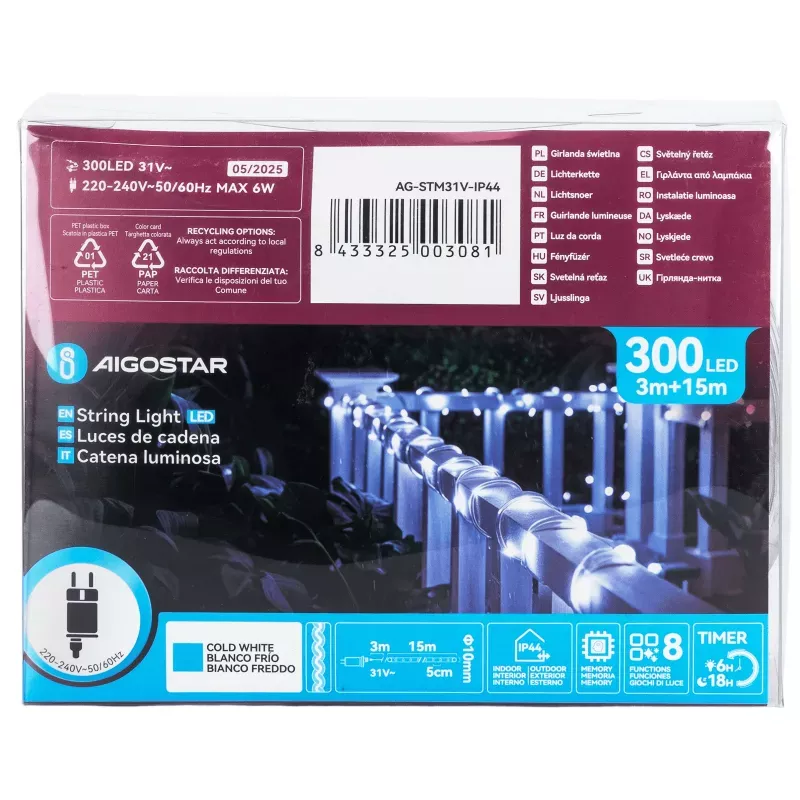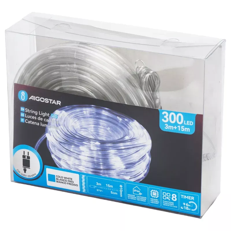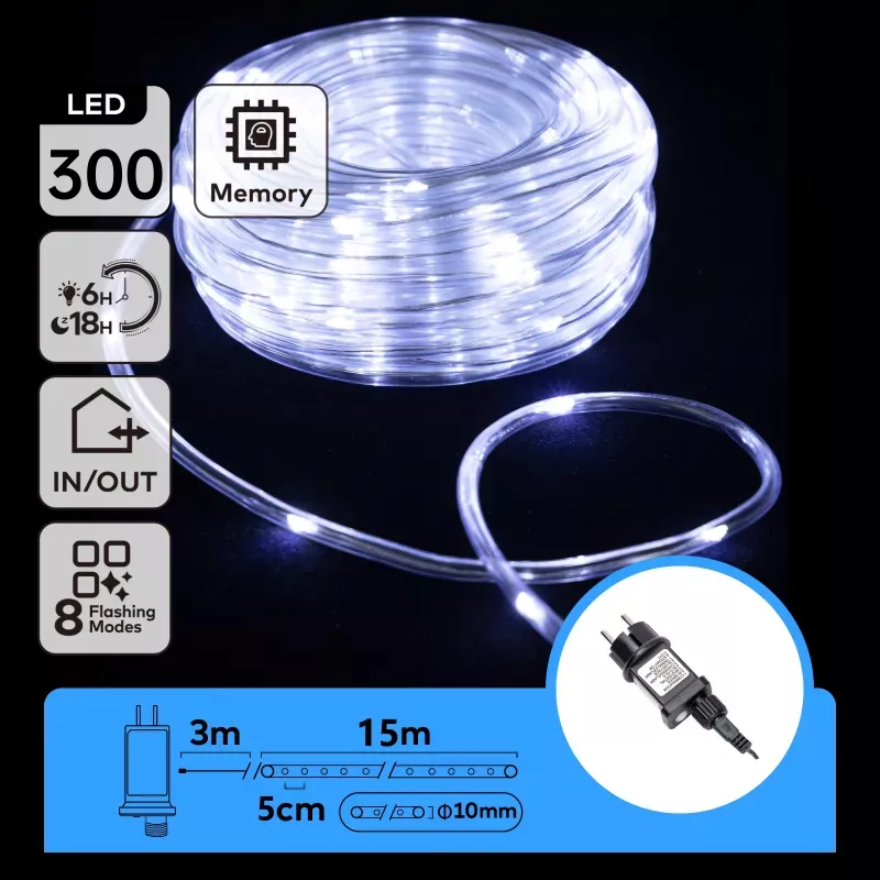 Niskonapięciowe lampki choinkowe zasilane z bezpiecznym napięciem, zasilacz ze sterownikiem w komplecie. Całość stanowi komplet gotowy do powieszenia i podłączenia do sieci 230V (zewnętrzne gniazdko sieciowe lub przedłużacz, do którego zostaną podłączone należy jakoś zabezpieczyć przed deszczem lub śniegiem).