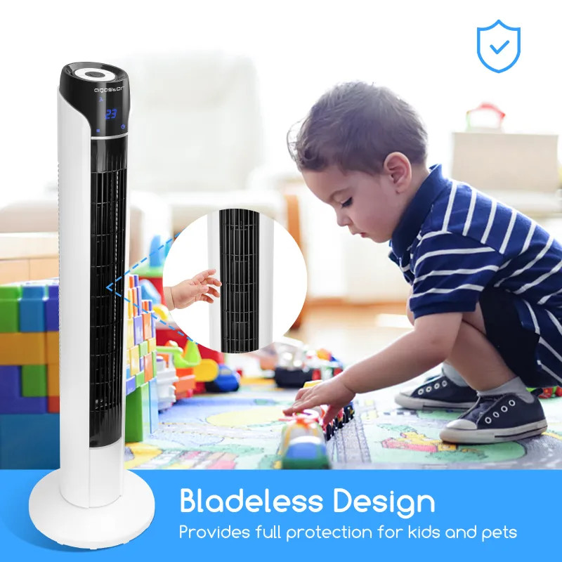 Prosty i elegancki, oszczędzający miejsce, pasujący do innych wszelkiego rodzaju mebli. Bezpieczna konstrukcja bez łopatek, zapewniająca przytulny wiatr. LCD i wykrywanie temperatury w czasie rzeczywistym, łatwe w obsłudze. Kontrola ilości powietrza i szeroki dopływ chłodnego powietrza w upalne lato. Dzięki zdalnemu sterowaniu można nim sterować bez ruchu, dobre urządzenie dla „leniwego człowieka". Wygodna konstrukcja uchwytu, łatwe przenoszenie. Podstawa zapobiegająca przewróceniu się, bezpieczna i stabilna. Wysokiej jakości konstrukcja kanału wentylacyjnego sprawia, że wiatr staje się delikatniejszy i bardziej naturalny, zapewnia świeże i chłodne lato..3 prędkości i 3 poziomy nawiewu tryby swobodnej kontroli, spełniają codzienne zastosowania. 15-godzinne wyłączenie czasowe, cicha praca, ciesz się chłodnym i przytulnym czasem. Szerokokątny nawiew powietrza 70°, wiatr wieje dalej i pokrywa więcej miejsca.