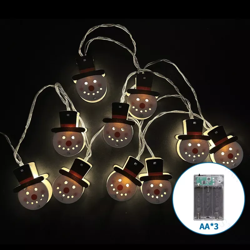 Lampki choinkowe 10 LED na 3 baterie AA - drewniana zawieszka bałwanek-ciepłe