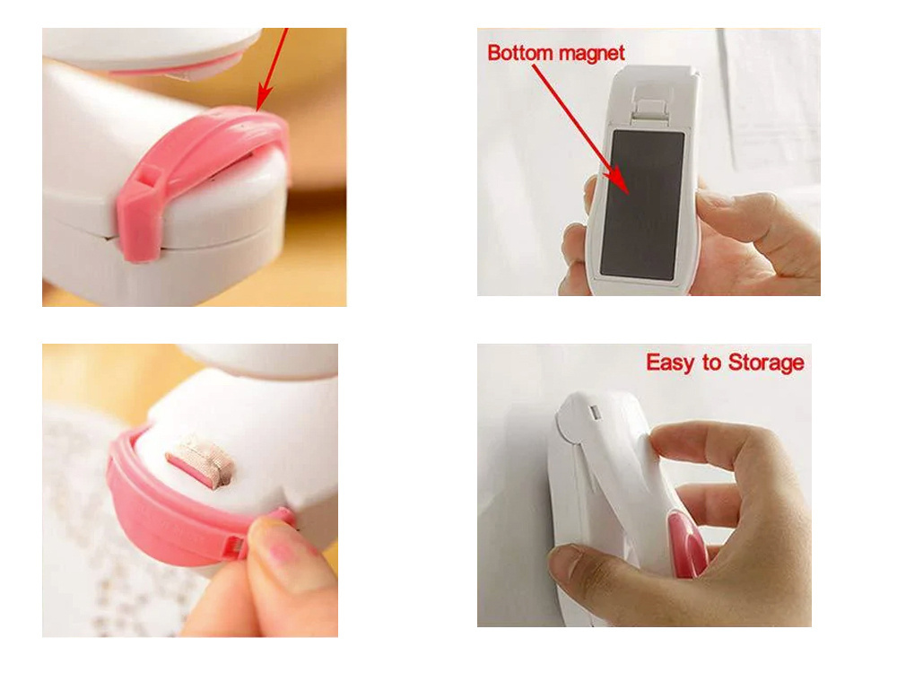 Dodatkowo zgrzewarka posiada na odwrocie płytkę z magnesem, dzięki czemu możesz ją umieścić np: na lodówce, aby mieć ją zawsze pod ręką. Posiada również specjalny uchwyt dystansujący, który zabezpiecza przed przypadkowym zaciśnięciem zgrzewarki. Przed użyciem wystarczy go opuścić.
